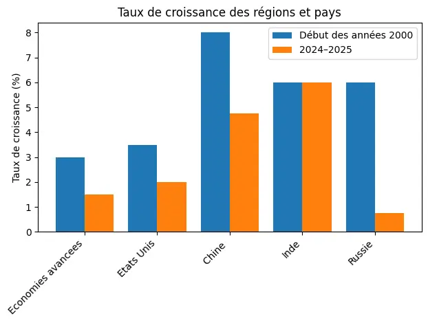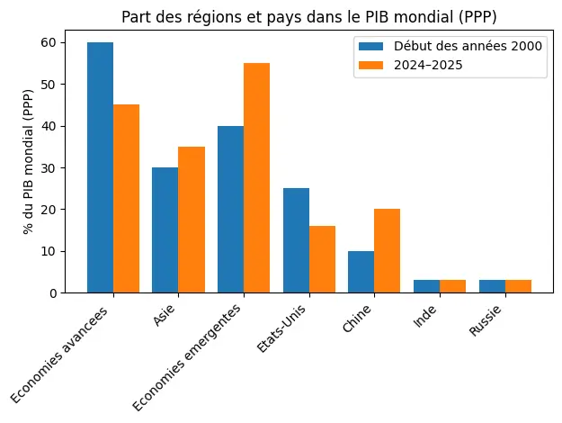 En termes relatifs, la part des économies avancées dans le PIB mondial est passée d’environ 60 % au début des années 2000 à moins de 45 % aujourd’hui (en PPA). Cette évolution ne traduit pas un déclin absolu, mais la fin d’un rôle hégémonique en tant que moteur principal de la croissance mondiale.