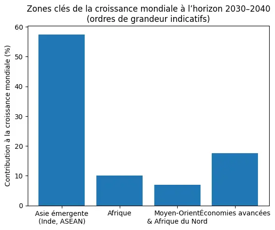 À l’horizon 2030-2040, la croissance mondiale ne sera ni homogène ni spontanément convergente. Elle restera fortement concentrée dans un nombre limité de régions, en fonction de dynamiques différenciées de démographie, de productivité, d’industrialisation, de maîtrise technologique et de qualité institutionnelle.