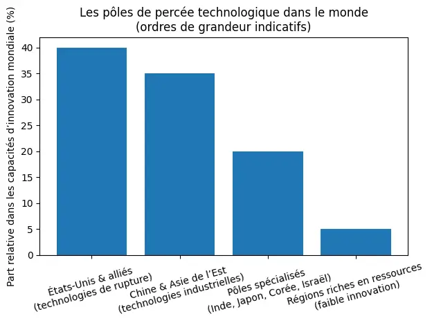 Dans ce nouvel environnement, la croissance mondiale se déplace durablement hors du noyau occidental. Parallèlement, les capacités d’innovation et de maîtrise technologique se concentrent dans quelques pôles, souvent dissociés des zones de production des matières premières.